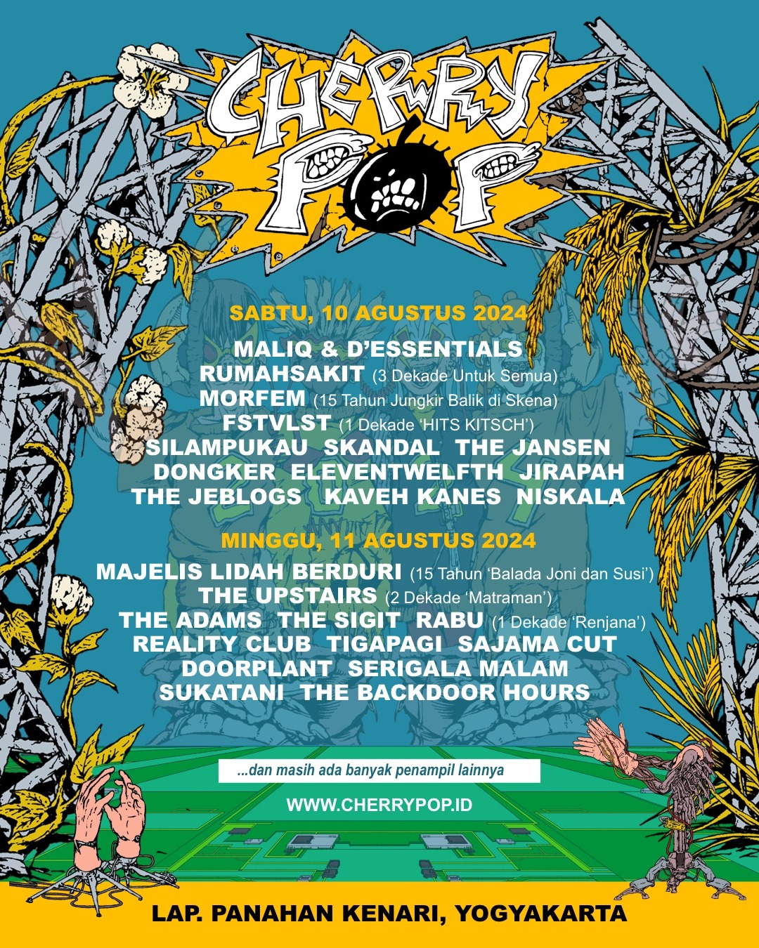 Cherrypop 2024 kembali menghadirkan tiga panggung musik selama dua hari, yang akan diisi oleh puluhan penampil dari beberapa genre, dari emerging band yang baru muncul ke permukaan hingga band era 90-an yang masih eksis hingga saat ini.