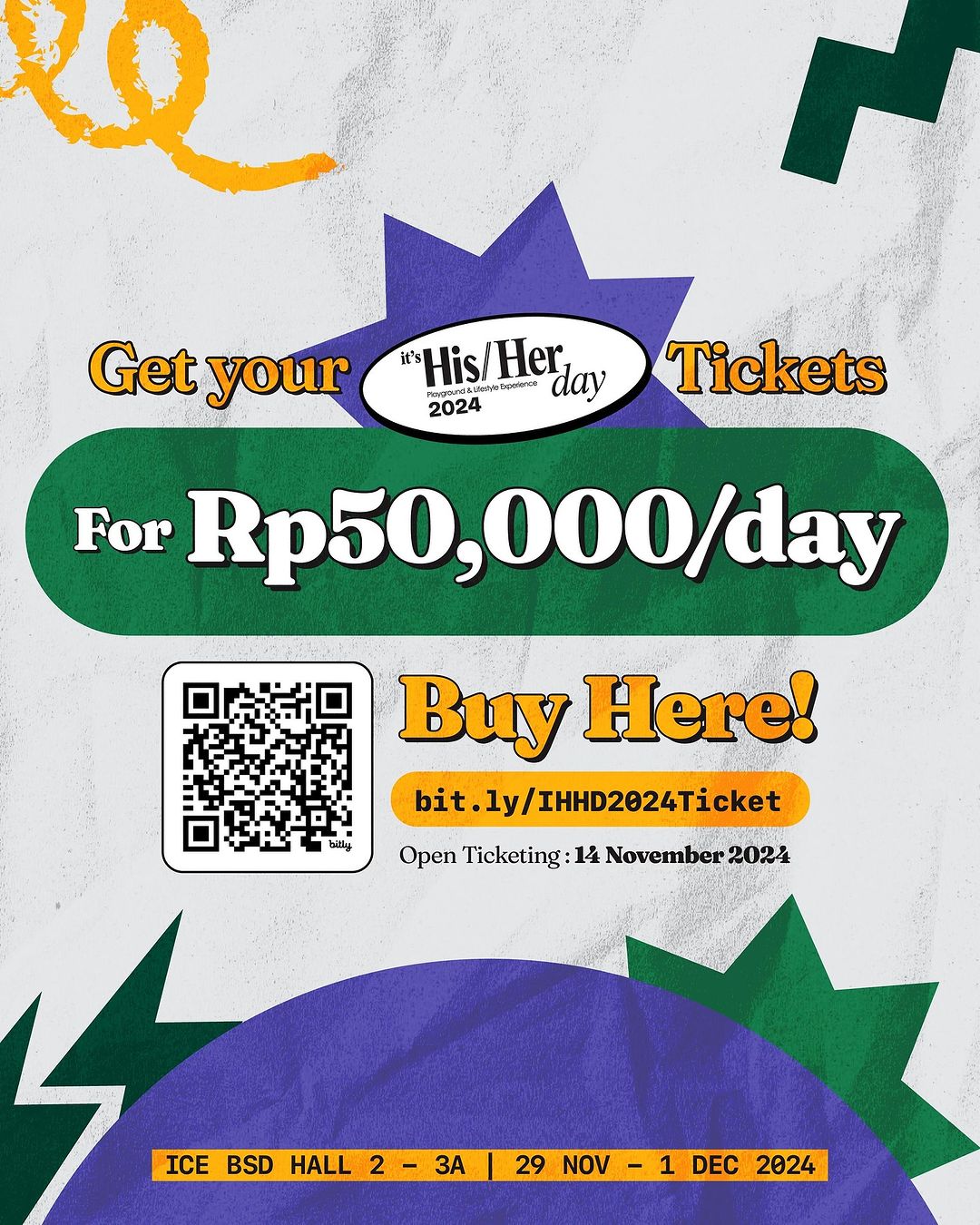 Harga tiket masuk hanya Rp 50.000,- per hari, namun bagi pengunjung yang beruntung, IT’S HIS/HER DAY 2024 juga menawarkan kesempatan untuk mendapatkan tiket dengan diskon hingga 50%, bahkan tersedia tiket seharga Rp. 1,- pada periode promosi terbatas.