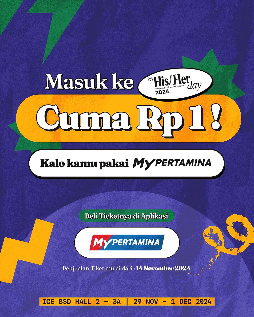 - Promo Pertamina: Rp. 1,- untuk setiap pembelian tiket IHHD 2024 melalui aplikasi MyPertamina.