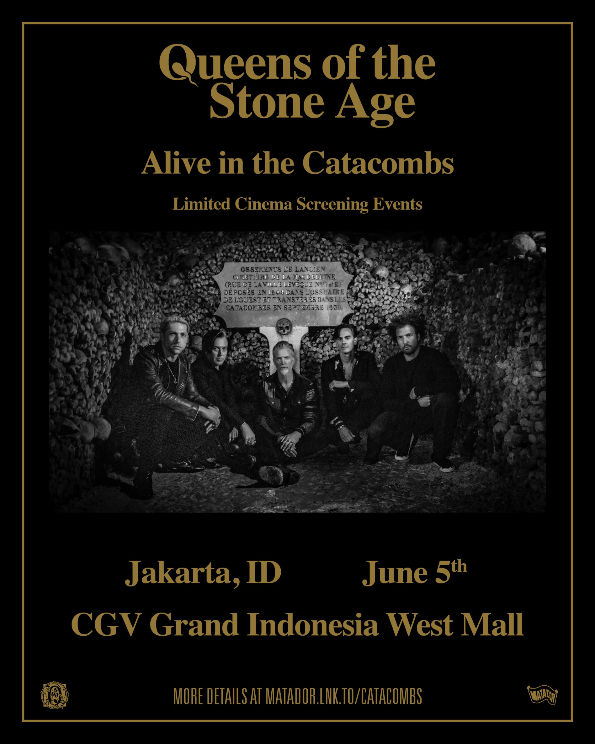 South Jakarta – Band rock Queens of the Stone Age mengungkap realisasi sinematik dari sebuah mimpi melalui penayangan perdana Alive in the Catacombs pada 5 Juni, sebuah dokumentasi audiovisual dari pertunjukan band yang telah lama menjadi rumor, di lorong-lorong Katakombe Paris yang terkenal.