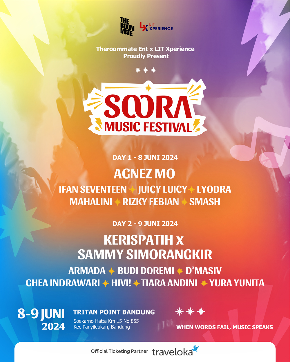 SOORA Music Festival 2024 – When Words Fail,Music Speaks diharapkan akan menjadi destinasi hiburan penting bagi komunitas musik Indonesia yang ada di Kota Bandung, hadir menyuguhkan hiburan musik populer dengan suasana yang menyenangkan.