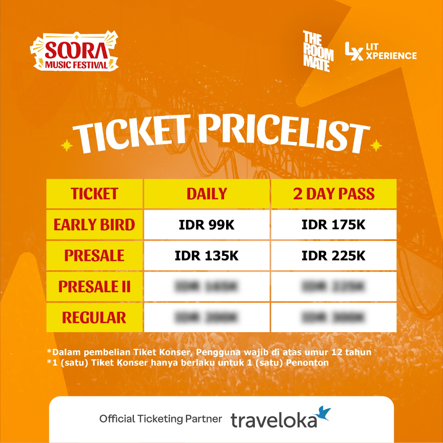Untuk informasi lebih lanjut tentang SOORA Music Festival 2024 dan cara pembelian tiket, ikuti kami di laman media sosial Instagram @SooraMusicFestival. Tiket resmi hanya dijual secara online hanya melalui gerai ticketing resmi traveloka.